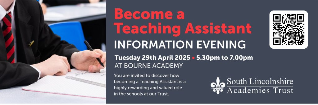 On Tuesday 29th April 2025, we will be holding a ‘Become a Teaching Assistant’ information evening at Bourne Academy where you can drop-in anytime between 5.30pm to 7.00pm for the opportunity to speak to our staff for more information about the role and how it can also further develop your career in our Trust.