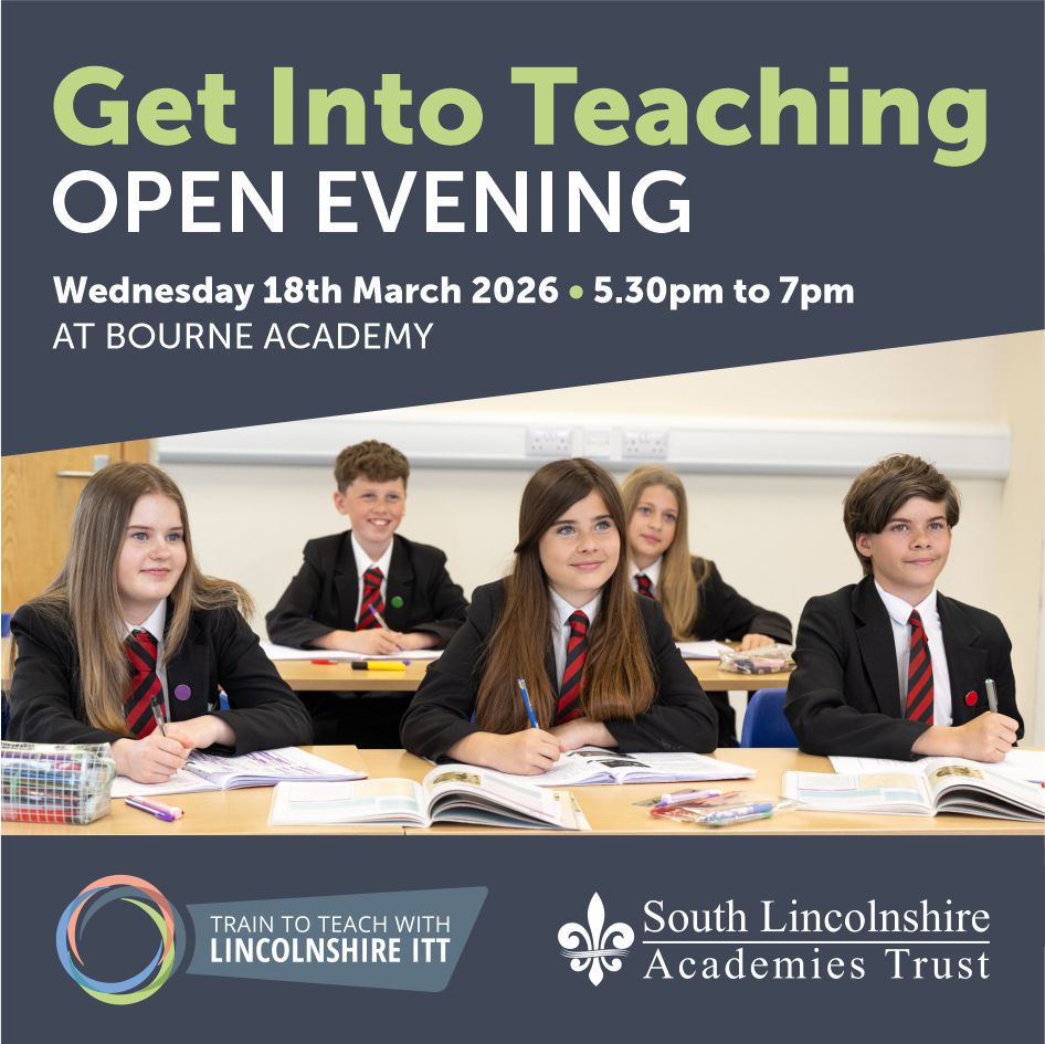 We will be holding a ‘Get Into Teaching’ event on Wednesday 18th March 2026 from 5.30pm to 7.00pm at Bourne Academy, where you will discover how you can gain a recognised teaching qualification with our one-year school centred Initial Teacher Training.
