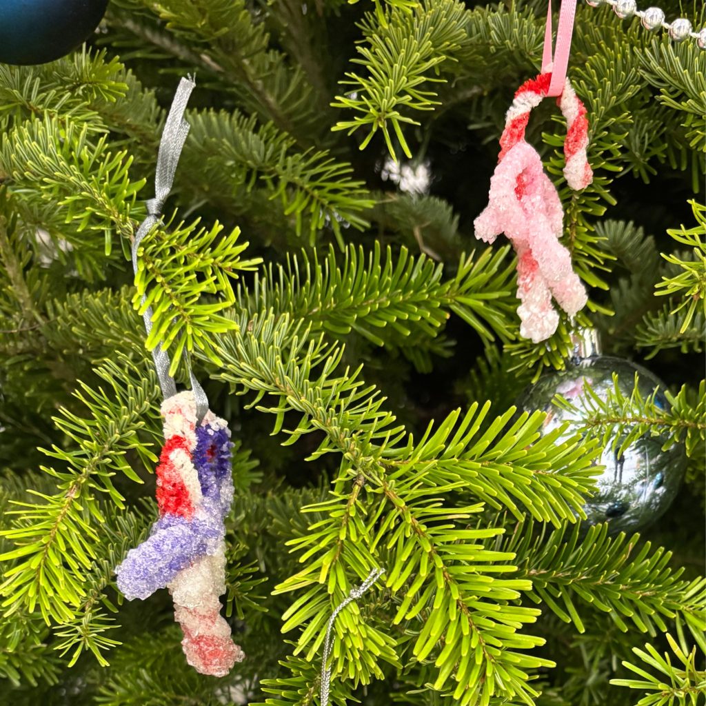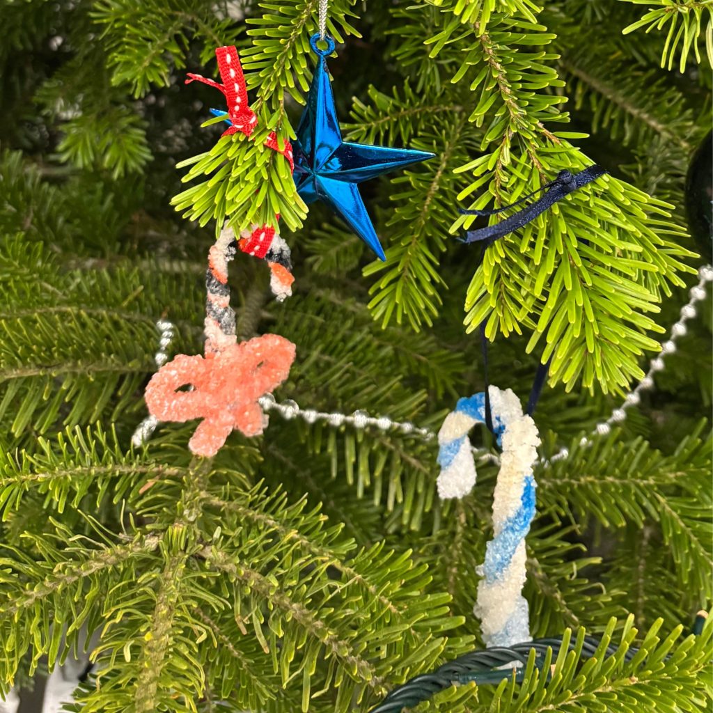 Firstly, students made festive shapes (such as candy canes, wreaths and even a reindeer) out of the coloured pipe cleaners and then suspended them in a jar with the alum solution until crystals formed. After a long wait and the drying process, the decorations are then perfect to proudly display on the Christmas tree.